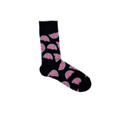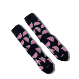 Step into joy with Sweet Chaos socks—a playful mix of vibrant pink and green watermelon slices scattered on a deep black background. Perfectly capturing days filled with lively chaos and heartfelt laughter, these socks add a fun, expressive touch to any outfit.